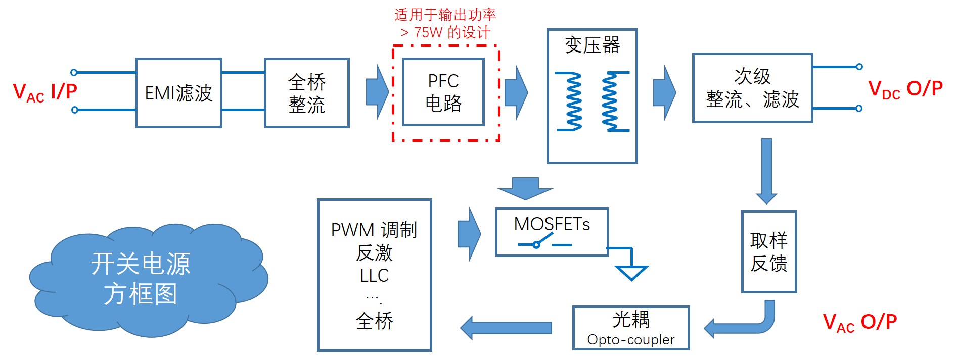 開關(guān)電源主要由防浪涌電路、電磁干擾濾波電路(EMI)、初級(jí)整流濾波電路、功率因數(shù)校正電路(PFC)、PWM 控制電路、功率轉(zhuǎn)換電路、輸出整流濾波電路、取樣反饋電路和保護(hù)電路等組成。